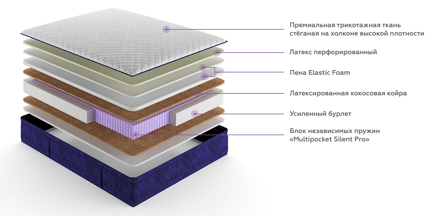Составляющиелатекс перфорированный - 20 мм; пена Elastic Foam - 40 мм; пена Elastic Foam - 20 мм (2 слоя); латексированная кокосовая койра - 20 мм (2 слоя); усиленный периметр; премиальная трикотажная ткань стёганая на холконе (Hollcon); высокоэластичная пена Orto Foam - 40мм